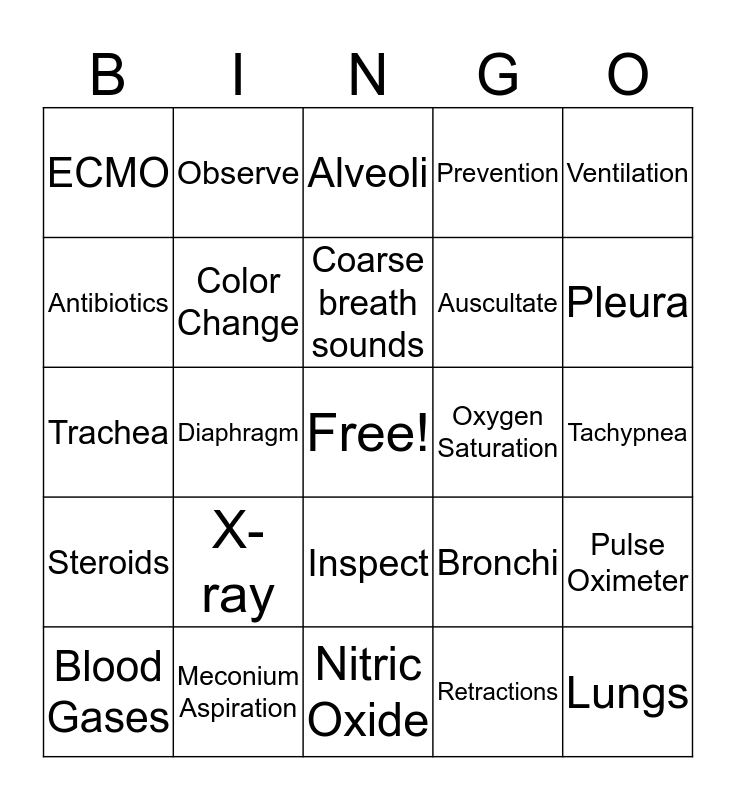This bingo card has a free space and 24 words: X-ray, Meconium Aspiration, Coarse breath sounds, Blood Gases, Ventilation, ECMO, Antibiotics, Observe, Oxygen Saturation, Inspect, Auscultate, Trachea, Bronchi, Pulse Oximeter, Color Change, Retractions, Tachypnea, Alveoli, Pleura, Diaphragm, Lungs, Steroids, Prevention and Nitric Oxide.