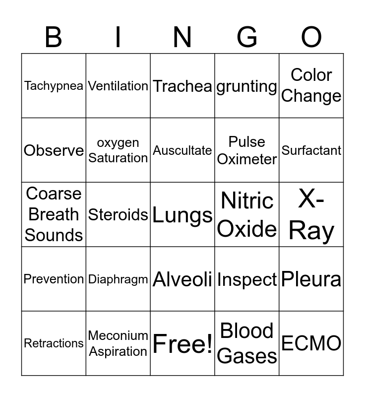 This bingo card has 25 words: Prevention, Meconium Aspiration, Lungs, Blood Gases, Color Change, Tachypnea, Ventilation, Trachea, Nitric Oxide, Pleura, Observe, oxygen Saturation, Free!, Inspect, Surfactant, Retractions, Steroids, Auscultate, Pulse Oximeter, X-Ray, Coarse Breath Sounds, Diaphragm, Alveoli, grunting and ECMO.