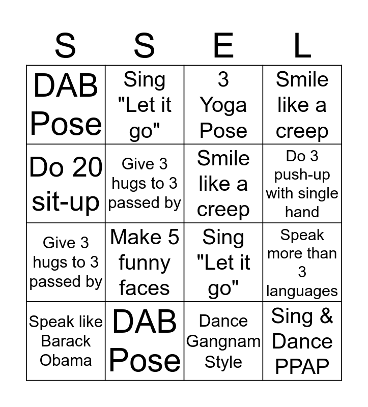 ⚠ This card has duplicate items: DAB Pose (2), 3 Yoga Pose (2), Sing "Let it go" (2), Sing & Dance PPAP (2), Give 3 hugs to 3 passed by (2), Smile like a creep (2)