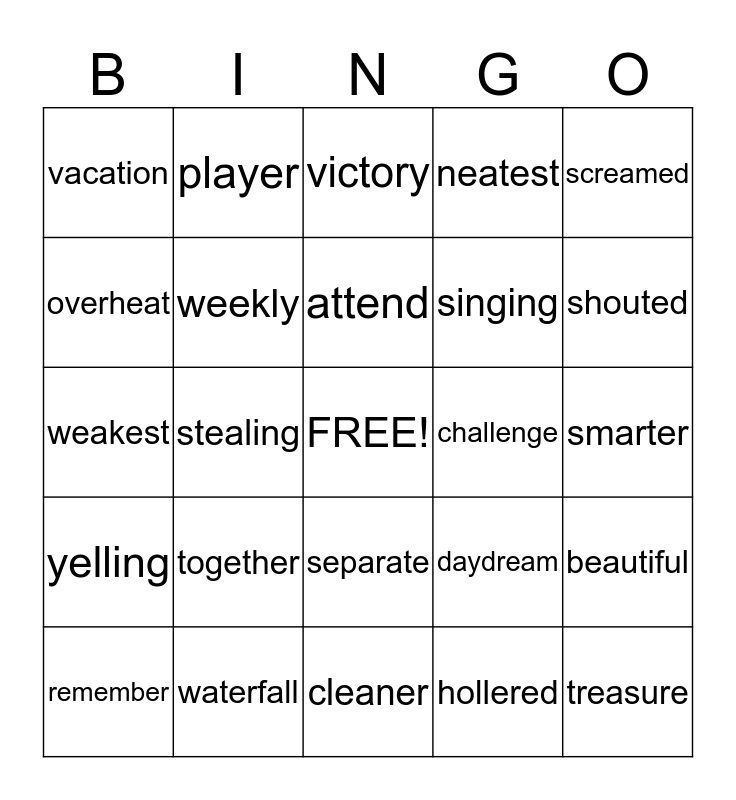 This bingo card has a free space and 24 words: remember, together, attend, hollered, screamed, vacation, player, victory, challenge, smarter, weakest, weekly, daydream, beautiful, overheat, waterfall, cleaner, neatest, shouted, yelling, stealing, separate, singing and treasure.