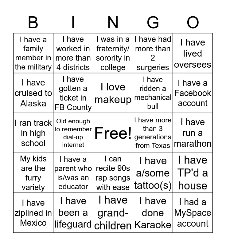 This bingo card has a free space and 24 words: I have a parent who is/was an educator, I have been a lifeguard, I love makeup, I have ziplined in Mexico, I have lived oversees, I have a family member in the military, I have cruised to Alaska, I have worked in more than 4 districts, I have more than 3 generations from Texas, I can recite 90s rap songs with ease, I have ridden a mechanical bull, I ran track in high school, I have a/some tattoo(s), I have TP'd a house, I have gotten a ticket in FB County, I have done Karaoke, I have run a marathon, I was in a fraternity/ sorority in college, I have a Facebook account, Old enough to remember dial-up internet, I had a MySpace account, My kids are the furry variety, I have had more than 2 surgeries and I have grand-children.
