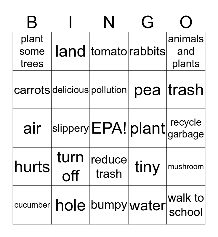 This bingo card has a free space and 24 words: turn off, hole, pollution, cucumber, animals and plants, plant some trees, carrots, land, plant, reduce trash, pea, air, tiny, mushroom, delicious, water, recycle garbage, tomato, trash, slippery, walk to school, hurts, rabbits and bumpy.