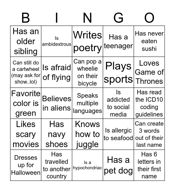 This bingo card has 25 words: Has navy shoes, Is a hypochondriac, Can pop a wheelie on their bicycle, Dresses up for Halloween, Has never eaten sushi, Has an older sibling, Can still do a cartwheel (may ask for show..lol), Is ambidextrous, Is addicted to social media, Knows how to juggle, Plays sports, Favorite color is green, Is allergic to seafood, Can create 3 words out of their last name, Is afraid of flying, Has 6 letters in their first name, Has read the ICD10 coding guidelines, Writes poetry, Loves Game of Thrones, Believes in aliens, Speaks multiple languages, Has travelled to another country, Likes scary movies, Has a teenager and Has a pet dog.