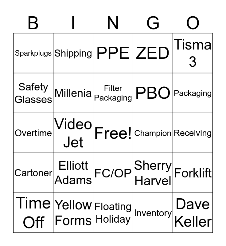 This bingo card has a free space and 24 words: Elliott Adams, Yellow Forms, Filter Packaging, Time Off, Tisma 3, Sparkplugs, Safety Glasses, Shipping, Champion, FC/OP, PBO, Overtime, Sherry Harvel, Forklift, Millenia, Inventory, Receiving, PPE, Packaging, Video Jet, Dave Keller, Cartoner, ZED and Floating Holiday.