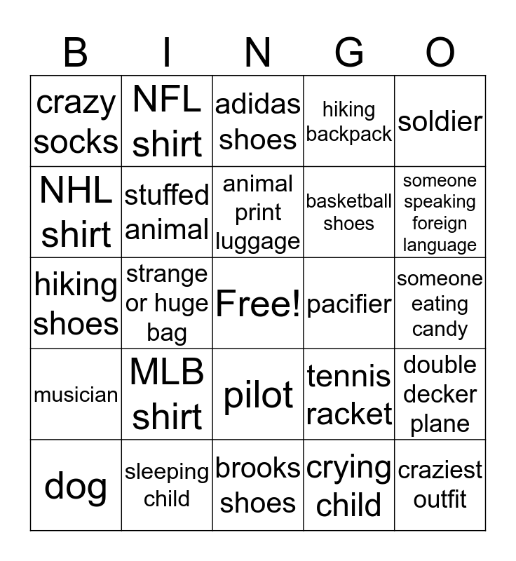 This bingo card has a free space and 24 words: MLB shirt, sleeping child, animal print luggage, dog, soldier, crazy socks, NHL shirt, NFL shirt, pacifier, pilot, basketball shoes, hiking shoes, tennis racket, double decker plane, stuffed animal, crying child, someone eating candy, adidas shoes, someone speaking foreign language, strange or huge bag, craziest outfit, musician, hiking backpack and brooks shoes.