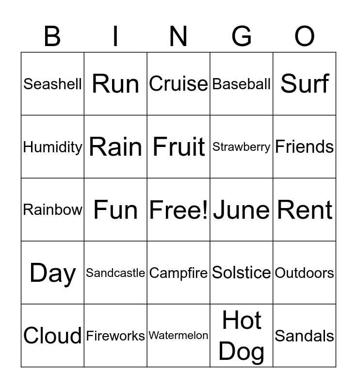 This bingo card has a free space and 117 words: Airplane, Apartment, Art Prize, August, Barbeque, Barefoot, Baseball, Beach, Beach Ball, Bee, Bike, Boat, Butterfly, Breeze, Cabin, Camp, Campfire, Car, Carnival, Cheerful, Cloud, Cruise, Concert, Constellation, Dance, Day, Fireworks, First Pacific, Fish, Flip Flops, Friends, Fruit, Fun, Games, Garden, Grand Rapids, Green, Grill, Hamburger, Happy, Hat, Heat, Hiking, Holiday, Home, Hot, Hot Dog, Humidity, Ice, Ice Cream, July, June, Kite, Lake, Lease, Lemonade, Memories, Michigan, Michigan Adventures, Moon, Outdoors, Park, Photos, Picnic, Play, Pool, Popsicle, Rain, Rainbow, Relax, Rent, Resort, River, Road Trip, Rose, Run, Sandals, Sandcastle, Seashell, Season, Shade, Shorts, Slide, S’mores, Solstice, Stars, Strawberry, Summer, Sunburn, Sunflower, Sunglasses, Sunscreen, Sunset, Sunrise, Sunshine, Surf, Stars, Swim, Swimsuit, Swing, T-Shirt, Tan, Tent, The Orchards, Travel, Tropical, Umbrella, U.S.A., Vacation, Warm, Watermelon, Waves, Weekend, Wildflowers, Woods, Yellow and Zoo.