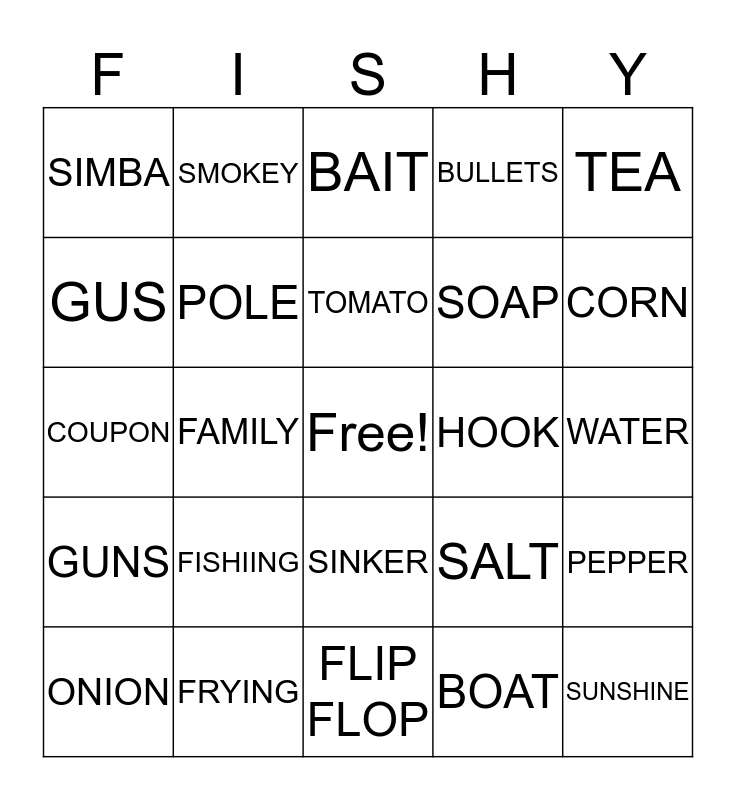 This bingo card has a free space and 24 words: FISHIING, FRYING, TOMATO, ONION, TEA, SIMBA, GUS, SMOKEY, HOOK, SINKER, SOAP, COUPON, SALT, PEPPER, POLE, BOAT, WATER, BAIT, CORN, FAMILY, SUNSHINE, GUNS, BULLETS and FLIP FLOP.