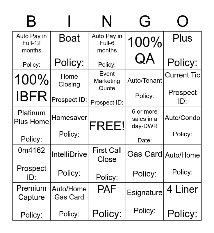 This bingo card has a free space and 24 words: IntelliDrive Policy:, Auto/Home Gas Card Policy:, Event Marketing Quote Prospect ID:, Premium Capture Policy:, Plus Policy:, Auto Pay in Full-12 months Policy:, 100% IBFR, Boat Policy:, 6 or more sales in a day-DWR Date:, First Call Close Policy:, Auto/Tenant Policy:, Platinum Plus Home Policy:, Gas Card Policy:, Auto/Home Policy:, Home Closing Prospect ID:, Esignature Policy:, Auto/Condo Policy:, Auto Pay in Full-6 months Policy:, Current Tic Prospect ID:, Homesaver Policy:, 4 Liner Policy:, 0m4162 Prospect ID:, 100% QA and PAF Policy:.