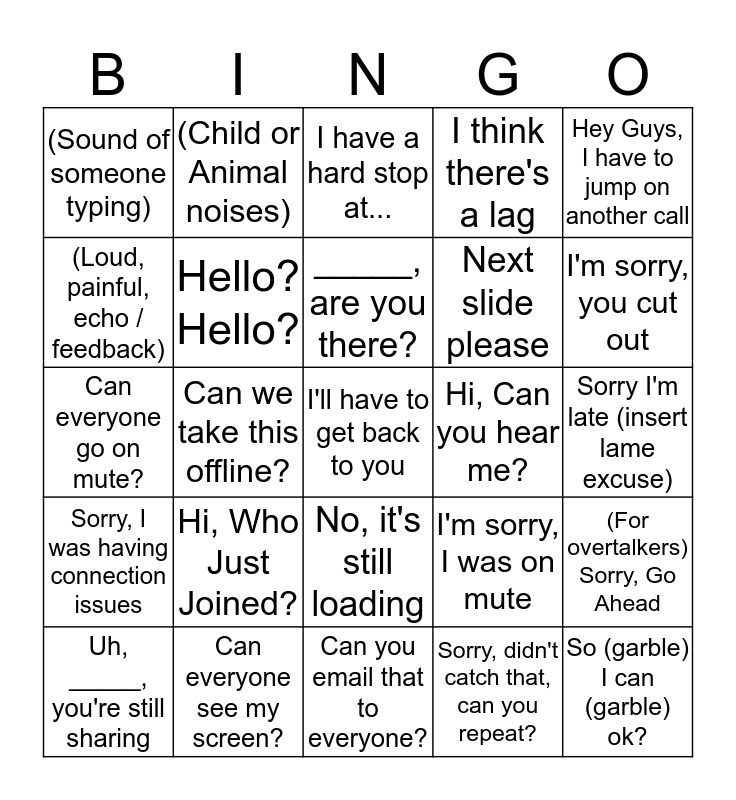 This bingo card has 25 words: Hi, Who Just Joined?, Can you email that to everyone?, _____, are you there?, Uh, _____, you're still sharing, Hey Guys, I have to jump on another call, (Sound of someone typing), (Loud, painful, echo / feedback), (Child or Animal noises), Hi, Can you hear me?, No, it's still loading, Next slide please, Can everyone go on mute?, I'm sorry, I was on mute, (For overtalkers) Sorry, Go Ahead, Hello?Hello?, So (garble) I can (garble) ok?, Sorry I'm late (insert lame excuse), I have a hard stop at..., I'm sorry, you cut out, Can we take this offline?, I'll have to get back to you, Can everyone see my screen?, Sorry, I was having connection issues, I think there's a lag and Sorry, didn't catch that, can you repeat?.