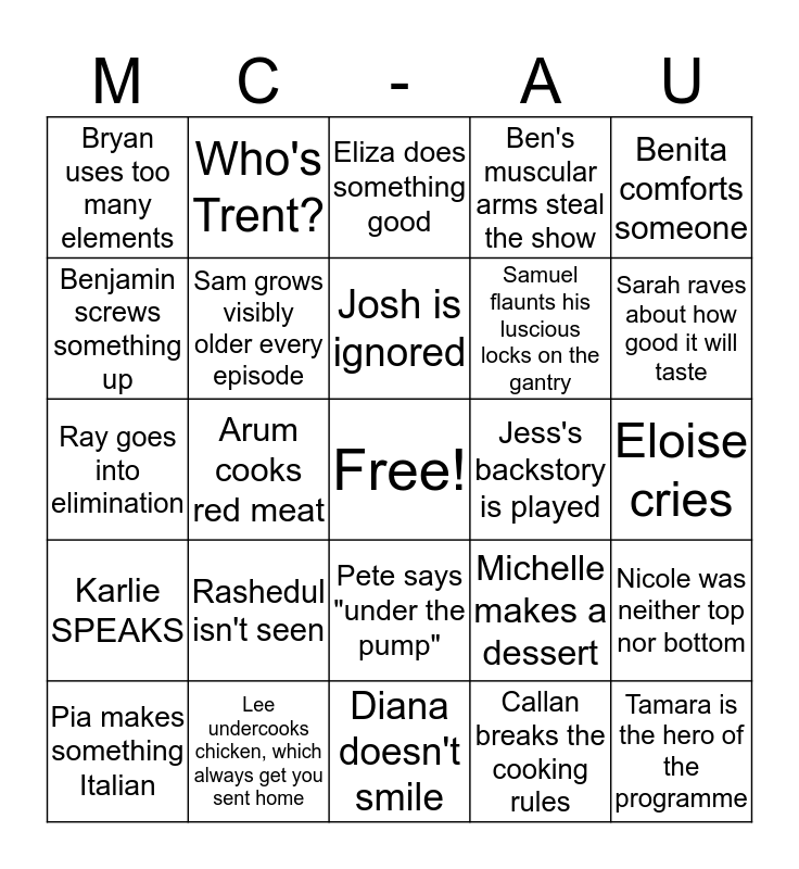 This bingo card has a free space and 24 words: Rashedul isn't seen, Lee undercooks chicken, which always get you sent home, Josh is ignored, Pia makes something Italian, Benita comforts someone, Bryan uses too many elements, Benjamin screws something up, Who's Trent?, Jess's backstory is played, Pete says "under the pump", Samuel flaunts his luscious locks on the gantry, Ray goes into elimination, Michelle makes a dessert, Nicole was neither top nor bottom, Sam grows visibly older every episode, Callan breaks the cooking rules, Eloise cries, Eliza does something good, Sarah raves about how good it will taste, Arum cooks red meat, Tamara is the hero of the programme, Karlie SPEAKS, Ben's muscular arms steal the show and Diana doesn't smile.