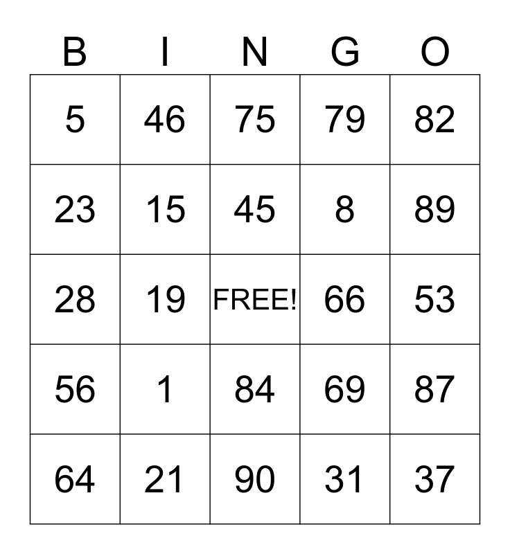 This bingo card has a free space and 24 words: 1, 21, 45, 64, 82, 5, 23, 46, 66, 84, 8, 28, 69, 87, 15, 31, 53, 75, 89, 19, 37, 56, 79 and 90.