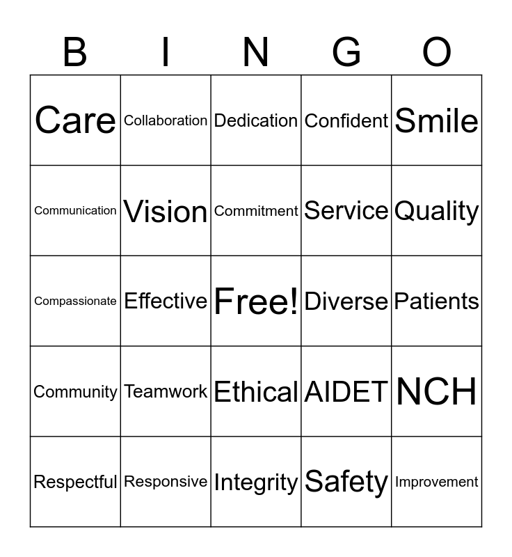 This bingo card has a free space and 28 words: NCH, Excellence, Service, Safety, Communication, Dedication, Collaboration, Community, Diverse, Respectful, Compassionate, Confident, Responsive, Integrity, Quality, Confidentiality, Teamwork, Vision, Commitment, Ethical, Care, Responsible, Improvement, Effective, Patients, AIDET, Smile and Thank.