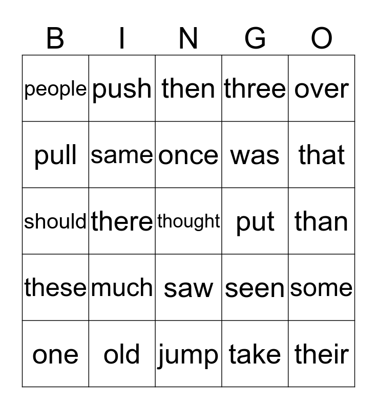 This bingo card has a free space and 24 words: much, old, once, one, over, people, pull, push, put, saw, was, should, seen, some, same, take, than, then, that, there, their, these, three and jump.