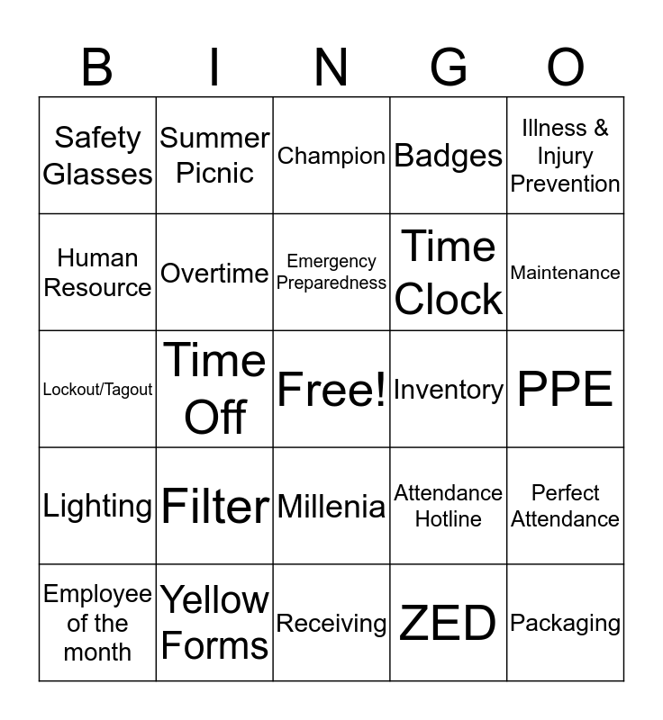 This bingo card has a free space and 30 words: Yellow Forms, Filter Packaging, Time Off, Tisma 3, Safety Glasses, Champion, Overtime, Millenia, Inventory, Receiving, PPE, Packaging, ZED, Floating Holiday, Maintenance, Break room, Attendance Hotline, Lighting, Filter, Illness & Injury Prevention, Lockout/Tagout, Federal-Mogul, Summer Picnic, Time Clock, Human Resource, Badges, Perfect Attendance, Employee of the month, Emergency Preparedness and OSHA.