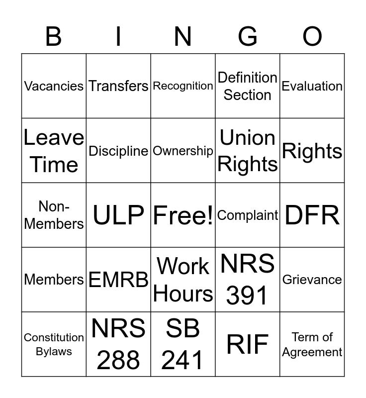 This bingo card has a free space and 24 words: EMRB, NRS 288, Ownership, Constitution Bylaws, Evaluation, Vacancies, Leave Time, Transfers, Complaint, Work Hours, Union Rights, Non- Members, NRS 391, Grievance, Discipline, RIF, DFR, Recognition, Rights, ULP, Term of Agreement, Members, Definition Section and SB 241.