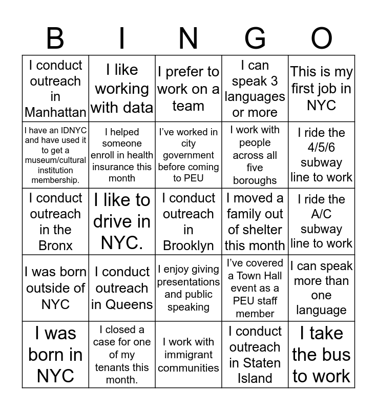 This bingo card has 25 words: I conduct outreach in Queens, I work with immigrant communities, I’ve worked in city government before coming to PEU, I was born in NYC, This is my first job in NYC, I conduct outreach in Manhattan, I have an IDNYC and have used it to get a museum/cultural institution membership., I like working with data, I moved a family out of shelter this month, I enjoy giving presentations and public speaking, I work with people across all five boroughs, I conduct outreach in the Bronx, I’ve covered a Town Hall event as a PEU staff member, I can speak more than one language, I helped someone enroll in health insurance this month, I take the bus to work, I ride the A/C subway line to work, I prefer to work on a team, I ride the 4/5/6 subway line to work, I like to drive in NYC., I conduct outreach in Brooklyn, I closed a case for one of my tenants this month., I was born outside of NYC, I can speak 3 languages or more and I conduct outreach in Staten Island.