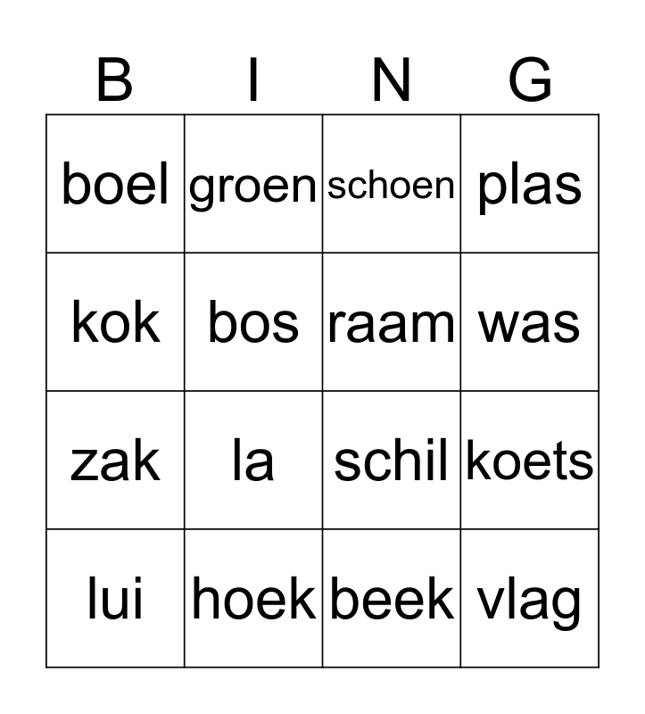 This bingo card has 36 words: kast, spin, kaas, raam, pijn, vlag, was, verf, kok, meid, koets, plas, rein, hoek, la, boel, bed, stal, lui, schoen, beek, berg, fles, peer, koek, groen, schil, blik, zak, bos, wei, zee, vis, slaap, feest and slijk.