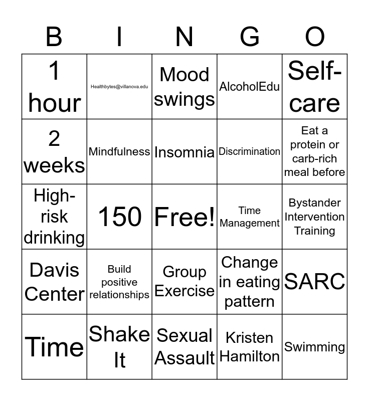 This bingo card has a free space and 24 words: Build positive relationships, Shake It, Insomnia, Time, Self-care, 1 hour, 2 weeks, Healthbytes@villanova.edu, Time Management, Group Exercise, Discrimination, High-risk drinking, Change in eating pattern, SARC, Mindfulness, Kristen Hamilton, Bystander Intervention Training, Mood swings, Eat a protein or carb-rich meal before, 150, Swimming, Davis Center, AlcoholEdu and Sexual Assault.