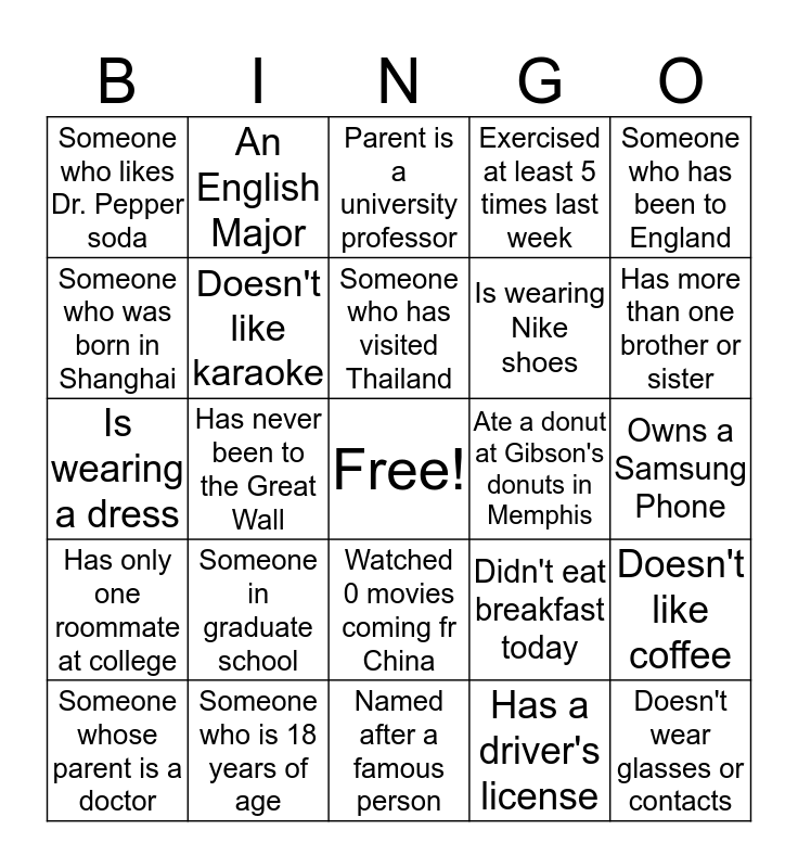 This bingo card has a free space and 24 words: Someone in graduate school, Someone who is 18 years of age, Someone who has visited Thailand, Someone whose parent is a doctor, Someone who has been to England, Someone who likes Dr. Pepper soda, Someone who was born in Shanghai, An English Major, Ate a donut at Gibson's donuts in Memphis, Watched 0 movies coming fr China, Is wearing Nike shoes, Is wearing a dress, Didn't eat breakfast today, Doesn't like coffee, Doesn't like karaoke, Has a driver's license, Owns a Samsung Phone, Parent is a university professor, Has more than one brother or sister, Has never been to the Great Wall, Doesn't wear glasses or contacts, Has only one roommate at college, Exercised at least 5 times last week and Named after a famous person.