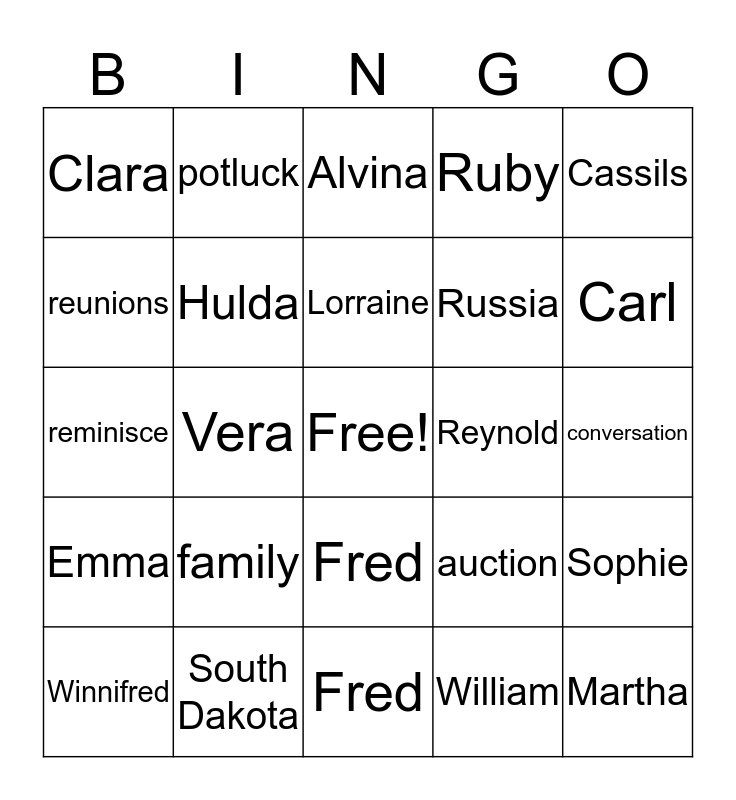 This bingo card has a free space and 24 words: family, South Dakota, Lorraine, Winnifred, Cassils, Clara, reunions, potluck, Reynold, Fred, Russia, reminisce, auction, Sophie, Hulda, William, conversation, Alvina, Carl, Vera, Martha, Emma, Ruby and Fred.