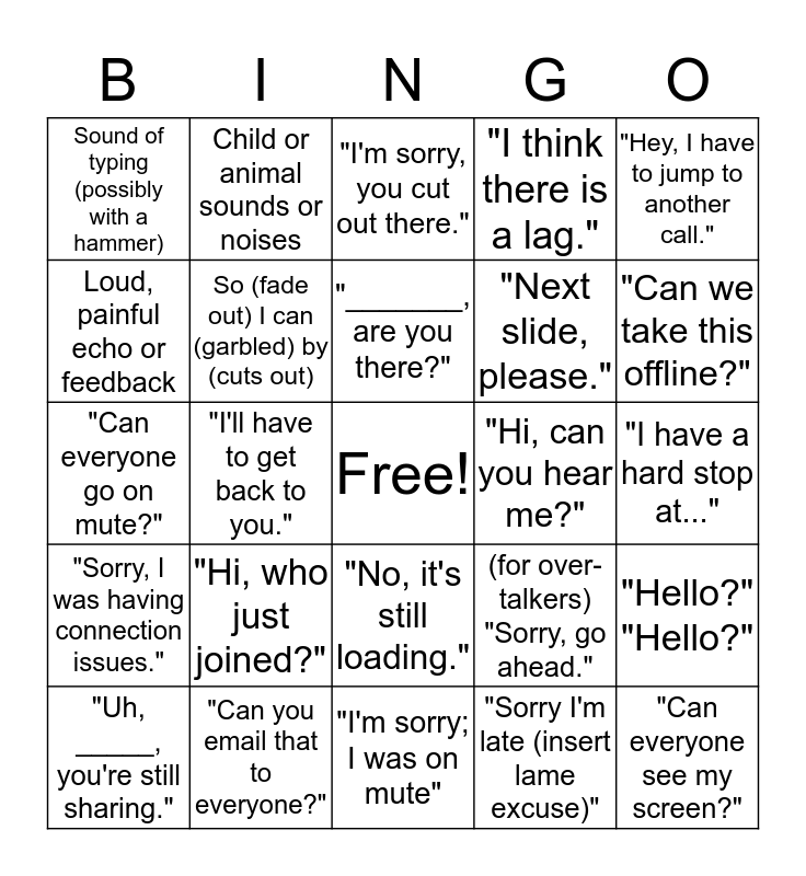This bingo card has a free space and 24 words: "Hi, who just joined?", "Can you email that to everyone?", "_______, are you there?", "Uh, _____, you're still sharing.", "Hey, I have to jump to another call.", Sound of typing (possibly with a hammer), Loud, painful echo or feedback, Child or animal sounds or noises, "Hi, can you hear me?", "No, it's still loading.", "Next slide, please.", "Can everyone go on mute?", (for over-talkers) "Sorry, go ahead.", "Hello?" "Hello?", So (fade out) I can (garbled) by (cuts out), "Sorry I'm late (insert lame excuse)", "I have a hard stop at...", "I'm sorry, you cut out there.", "Can we take this offline?", "I'll have to get back to you.", "Can everyone see my screen?", "Sorry, I was having connection issues.", "I think there is a lag." and "I'm sorry; I was on mute".