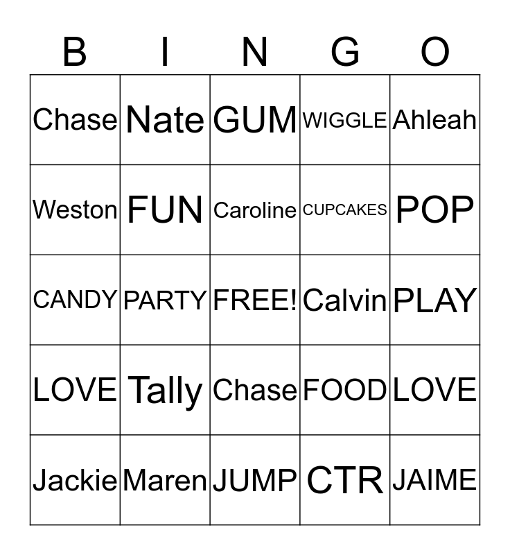 This bingo card has a free space and 24 words: Tally, Maren, Caroline, Jackie, Ahleah, Chase, Weston, Nate, Calvin, Chase, CUPCAKES, CANDY, FOOD, LOVE, FUN, CTR, PLAY, GUM, POP, PARTY, JAIME, LOVE, WIGGLE and JUMP.
