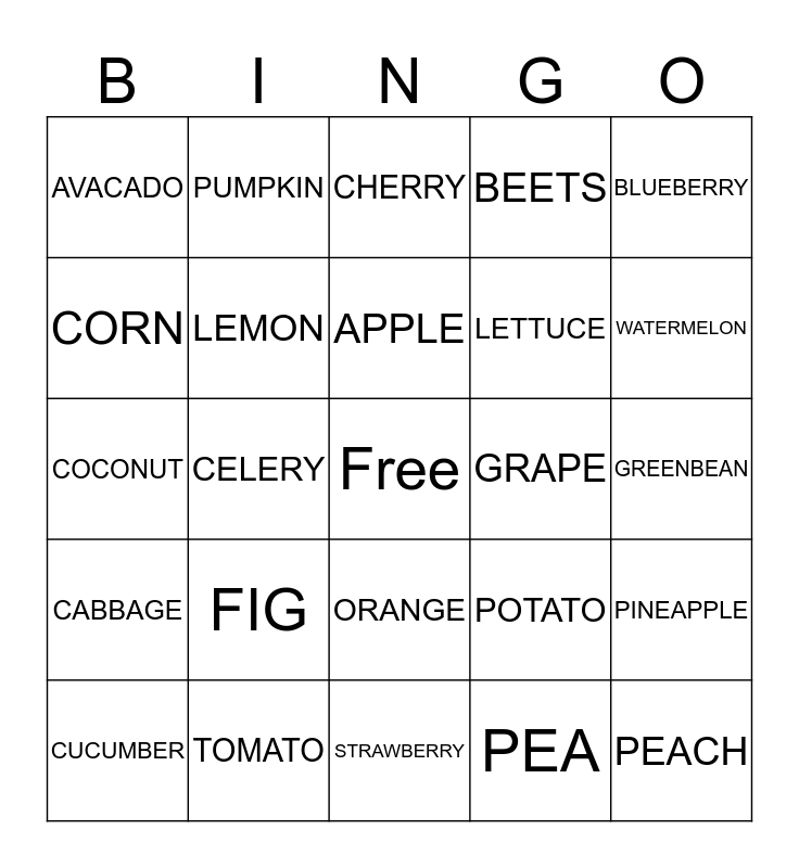 This bingo card has a free space and 24 words: FIG, TOMATO, APPLE, CUCUMBER, BLUEBERRY, AVACADO, CORN, PUMPKIN, GRAPE, ORANGE, LETTUCE, COCONUT, POTATO, PINEAPPLE, LEMON, PEA, GREENBEAN, CHERRY, WATERMELON, CELERY, PEACH, CABBAGE, BEETS and STRAWBERRY.