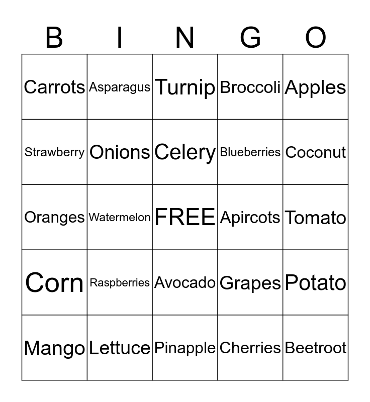 This bingo card has a free space and 24 words: Raspberries, Lettuce, Celery, Mango, Apples, Carrots, Strawberry, Asparagus, Apircots, Avocado, Blueberries, Oranges, Grapes, Potato, Onions, Cherries, Tomato, Turnip, Coconut, Watermelon, Beetroot, Corn, Broccoli and Pinapple.