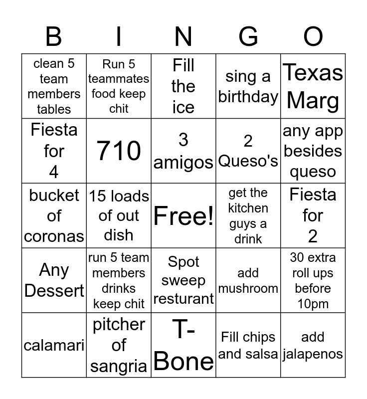 This bingo card has a free space and 24 words: run 5 team members drinks keep chit, pitcher of sangria, 3 amigos, calamari, Texas Marg, clean 5 team members tables, Fiesta for 4, Run 5 teammates food keep chit, get the kitchen guys a drink, Spot sweep resturant, 2 Queso's, bucket of coronas, add mushroom, 30 extra roll ups before 10pm, 710, Fill chips and salsa, Fiesta for 2, Fill the ice, any app besides queso, 15 loads of out dish, add jalapenos, Any Dessert, sing a birthday and T-Bone.