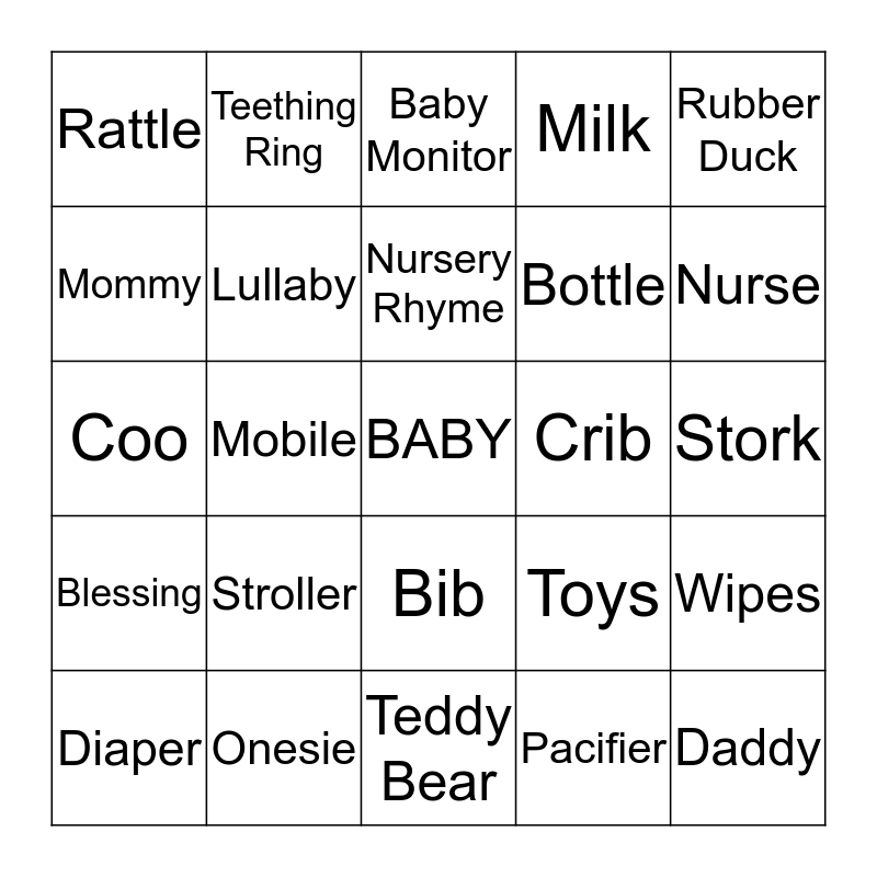 This bingo card has a free space and 24 words: Stroller, Onesie, Nursery Rhyme, Diaper, Rubber Duck, Rattle, Mommy, Teething Ring, Crib, Bib, Bottle, Coo, Toys, Wipes, Lullaby, Pacifier, Stork, Baby Monitor, Nurse, Mobile, Daddy, Blessing, Milk and Teddy Bear.