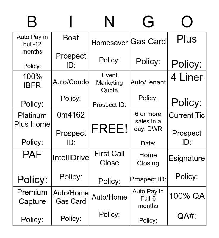 This bingo card has a free space and 24 words: IntelliDrive Policy:, Auto/Home Gas Card Policy:, Event Marketing Quote Prospect ID:, Premium Capture Policy:, Plus Policy:, Auto Pay in Full-12 months Policy:, 100% IBFR Policy:, Boat Prospect ID:, 6 or more sales in a day: DWR Date:, First Call Close Policy:, Auto/Tenant Policy:, Platinum Plus Home Policy:, Home Closing Prospect ID:, Esignature Policy:, Auto/Condo Policy:, Auto Pay in Full-6 months Policy:, Current Tic Prospect ID:, Homesaver Policy:, 4 Liner Policy:, 0m4162 Prospect ID:, 100% QA QA#:, PAF Policy:, Gas Card Policy: and Auto/Home Policy:.