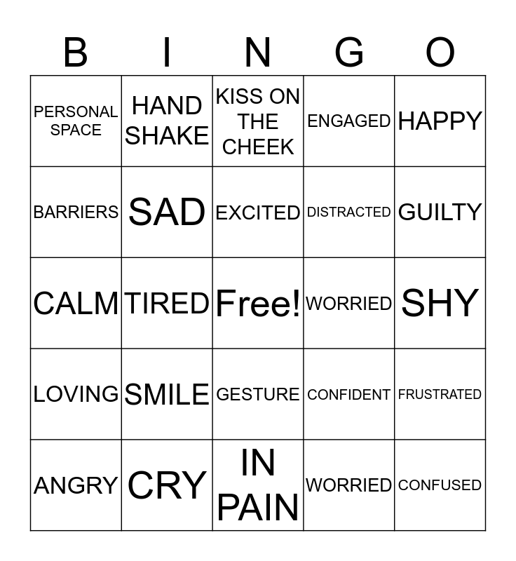 This bingo card has a free space and 24 words: SMILE, CRY, EXCITED, ANGRY, HAPPY, PERSONAL SPACE, BARRIERS, HAND SHAKE, WORRIED, GESTURE, DISTRACTED, CALM, CONFIDENT, FRUSTRATED, SAD, WORRIED, SHY, KISS ON THE CHEEK, GUILTY, TIRED, CONFUSED, LOVING, ENGAGED and IN PAIN.