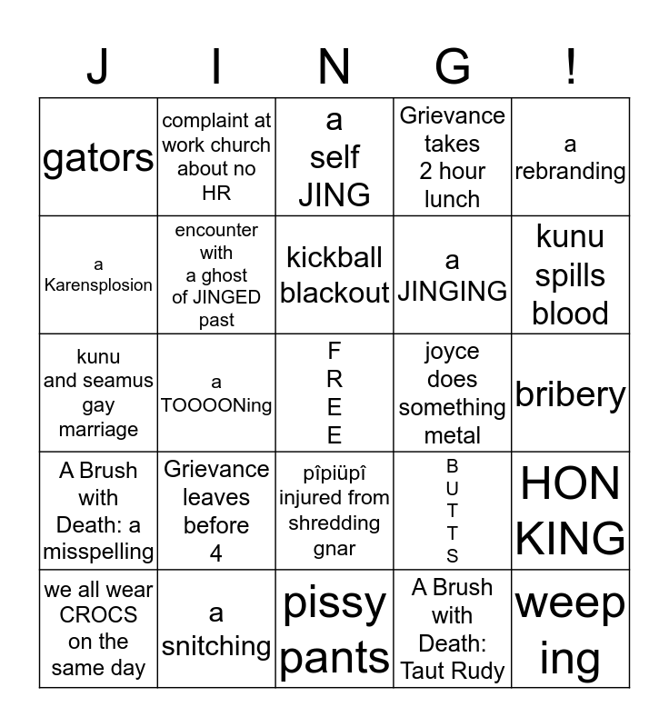 This bingo card has a free space and 24 words: Grievance leaves before 4, a snitching, kickball blackout, we all wear CROCS on the same day, a rebranding, gators, a Karensplosion, complaint at work church about no HR, joyce does something metal, pîpiüpî injured from shredding gnar, a JINGING, kunu and seamus gay marriage, B U T T S, HON KING, encounter with a ghost of JINGED past, A Brush with Death: Taut Rudy, bribery, a self JING, kunu spills blood, a TOOOONing, weep ing, A Brush with Death: a misspelling, Grievance takes 2 hour lunch and pissy pants.