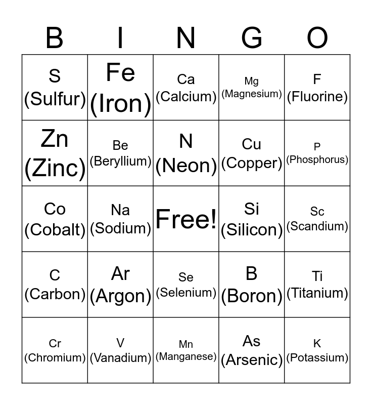 This bingo card has a free space and 36 words: H (Hydrogen), He (Helium), Li (Lithium), Be (Beryllium), B (Boron), C (Carbon), N (Neon), O (Oxygen), F (Fluorine), Ne (Neon), Na (Sodium), Mg (Magnesium), Al (Aluminum), Si (Silicon), P (Phosphorus), S (Sulfur), Cl (Chlorine), Ar (Argon), K (Potassium), Ca (Calcium), Sc (Scandium), Ti (Titanium), V (Vanadium), Cr (Chromium), Mn (Manganese), Fe (Iron), Co (Cobalt), Ni (Nickel), Cu (Copper), Zn (Zinc), Ga (Gallium), Ge (Germanium), As (Arsenic), Se (Selenium), Br (Bromine) and Kr (Krypton).