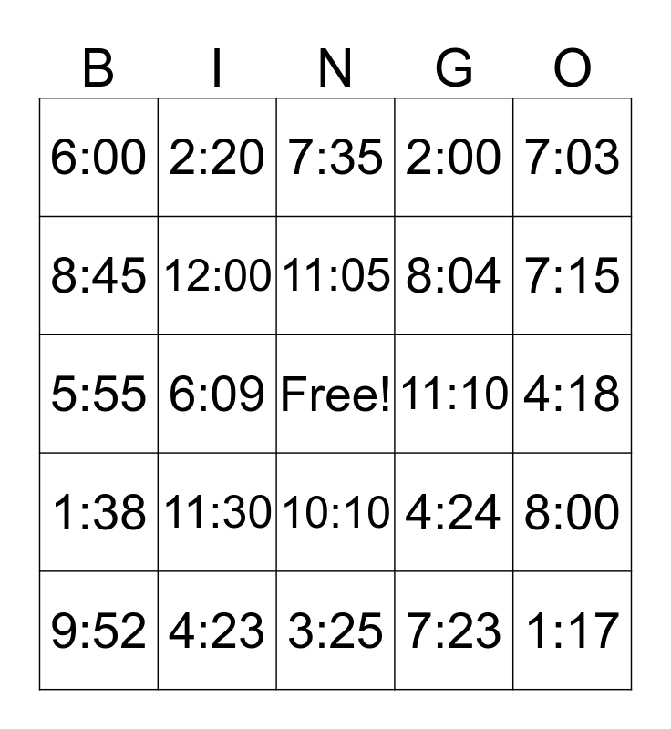 This bingo card has a free space and 24 words: 11:30, 4:23, 11:05, 9:52, 7:03, 6:00, 8:45, 2:20, 11:10, 10:10, 8:04, 5:55, 4:24, 8:00, 12:00, 7:23, 4:18, 7:35, 7:15, 6:09, 1:17, 1:38, 2:00 and 3:25.