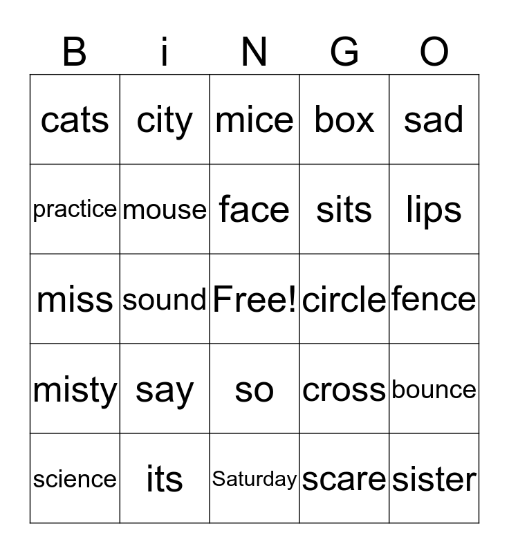 This bingo card has a free space and 24 words: say, its, face, science, sad, cats, practice, city, circle, so, sits, miss, cross, bounce, mouse, scare, fence, mice, lips, sound, sister, misty, box and Saturday.