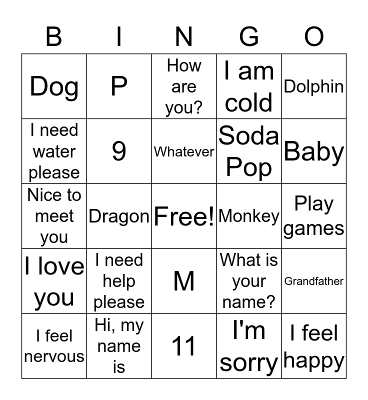 This bingo card has a free space and 24 words: I need help please, Hi, my name is, Whatever, I feel nervous, Dolphin, Dog, I need water please, P, Monkey, M, Soda Pop, Nice to meet you, What is your name?, Grandfather, 9, I'm sorry, Play games, How are you?, Baby, Dragon, I feel happy, I love you, I am cold and 11.