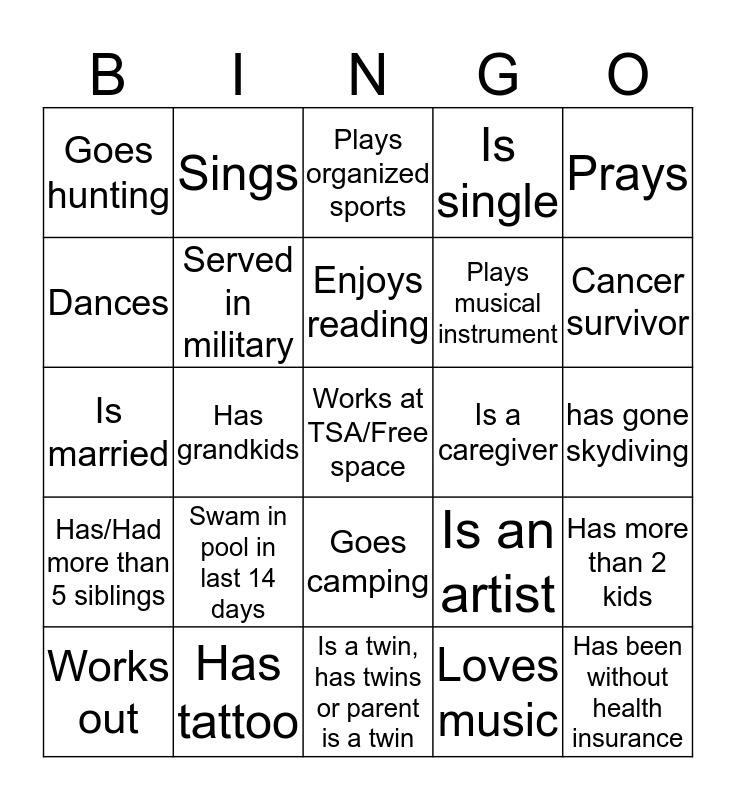 This bingo card has a free space and 24 words: Swam in pool in last 14 days, Has tattoo, Enjoys reading, Works out, Prays, Goes hunting, Dances, Sings, Is a caregiver, Goes camping, Plays musical instrument, Is married, Is an artist, Has more than 2 kids, Served in military, Loves music, has gone skydiving, Plays organized sports, Cancer survivor, Has grandkids, Has been without health insurance, Has/Had more than 5 siblings, Is single and Is a twin, has twins or parent is a twin.