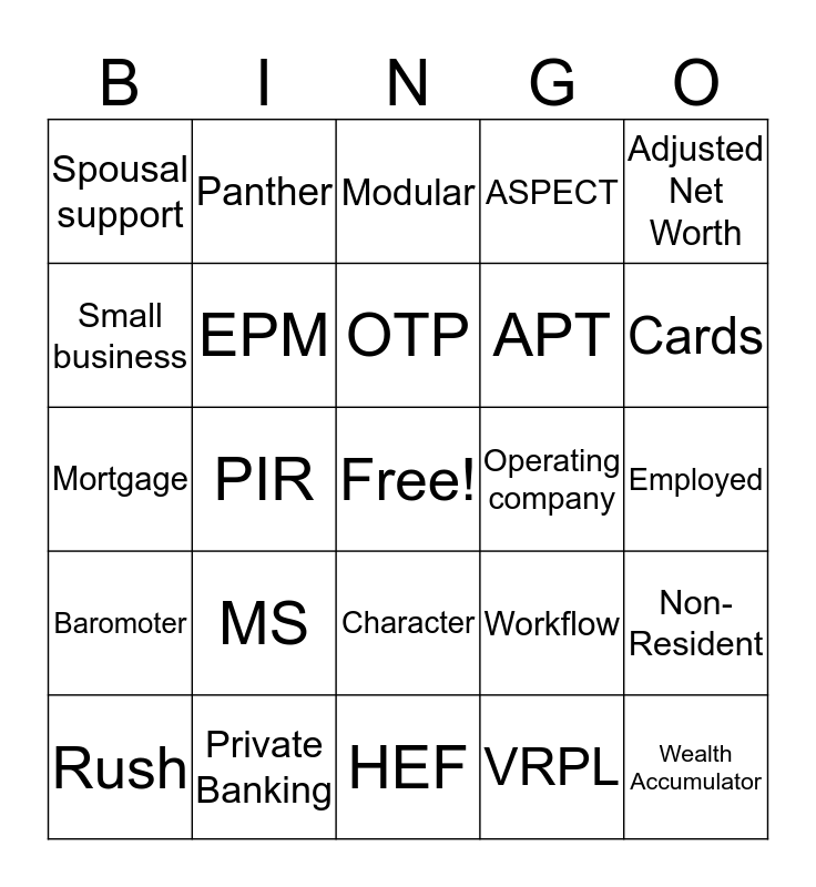 This bingo card has a free space and 87 words: Credit, Capacity, Character, Credit worthiness, Collateral, Co-borrower, Self employed, Construction, Investment, First Nations, Income, New to Canada, Non-Resident, Employed, Maternity leave, OTP, HLP, Bridge, IWS, RBOL, Visa, MasterCard, Mortgage, RCL, VRPL, FRPL, Credit bureau, LTV, NAS, Appraisal, Private Banking, Avion, Personal, MS, Small business, PFS Risk, Cards, Credit Support, National office, PIR, Worksheet, start-ups, project engineering firms, Operating company, Annual Operating Revenue, Adjusted Net Worth, Franchise Financing, Panther, Talent Link, St RCL, POP, HEF, Baromoter, Equity, special programs, Cottage, APT, Code of conduct, Arby, ASPECT, EPM, STI, Royal Performance, CAPSER, LINX, Seniors, Queues, Rush, Wealth Accumulator, Work Permit, Secured visa, Folio, Modular, Workflow, FPPL7, Exception, demand, HEF, EI code, moorage, capital loan, secured visa, Refugee PR, T4RIFF, Dividend, Spousal support and Country Risk Rating.