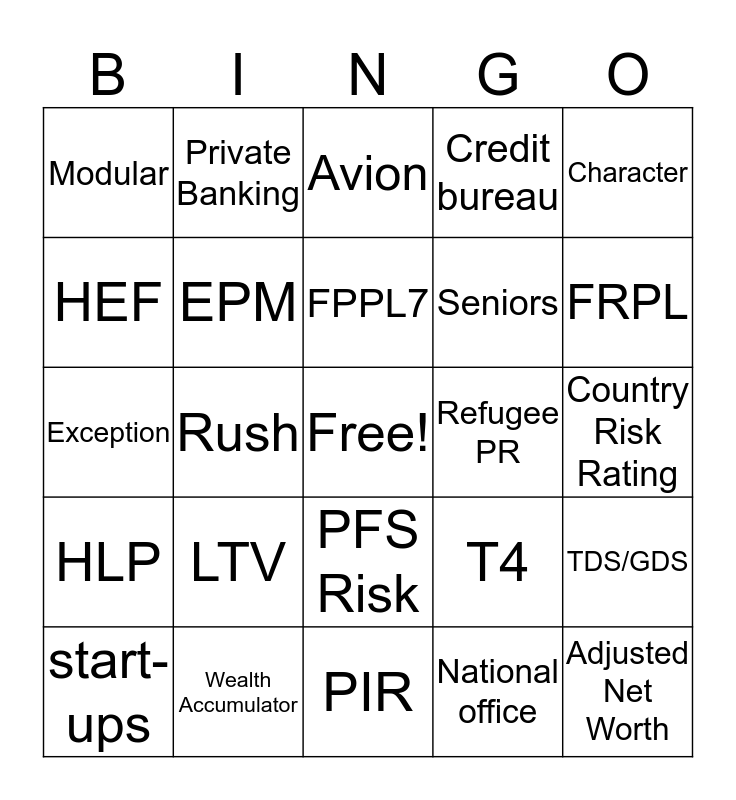 This bingo card has a free space and 101 words: Credit, Capacity, Character, Credit worthiness, Collateral, Co-borrower, Self employed, Construction, Investment, First Nations, Income, New to Canada, Non-Resident, Employed, Maternity leave, OTP, HLP, Bridge, IWS, RBOL, Visa, MasterCard, Mortgage, RCL, VRPL, FRPL, Credit bureau, LTV, NAS, Appraisal, Private Banking, Avion, Personal, MS, Small business, PFS Risk, Cards, Credit Support, National office, PIR, Worksheet, start-ups, project engineering firms, Operating company, Annual Operating Revenue, Adjusted Net Worth, Franchise Financing, Panther, Talent Link, St RCL, POP, HEF, Barometer, Equity, special programs, Cottage, APT, Code of conduct, Arby, ASPECT, EPM, STI, Royal Performance, CAPSER, LINX, Seniors, Queues, Rush, Wealth Accumulator, Work Permit, Secured visa, Folio, Modular, Workflow, FPPL7, Exception, demand, HEF, EI code, moorage, capital loan, secured visa, Refugee PR, T4RIFF, Dividend, Spousal support, Country Risk Rating, Purchase prior to sale, HECC, Mortgage Specialist, T4, Statement of Business Activities, T776, Statement of Real Estate Rentals, DLA, TDS/GDS, GDS Benchmark, Bad Debt, Employment, Co-borrower and Guarantor.