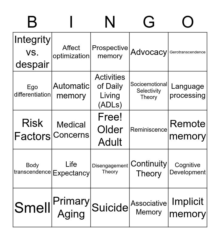 This bingo card has a free space and 24 words: Life Expectancy, Primary Aging, Activities of Daily Living (ADLs), Smell, Gerotranscendence, Integrity vs. despair, Ego differentiation, Affect optimization, Reminiscence, Disengagement Theory, Socioemotional Selectivity Theory, Risk Factors, Continuity Theory, Cognitive Development, Automatic memory, Associative Memory, Remote memory, Prospective memory, Language processing, Medical Concerns, Implicit memory, Body transcendence, Advocacy and Suicide.