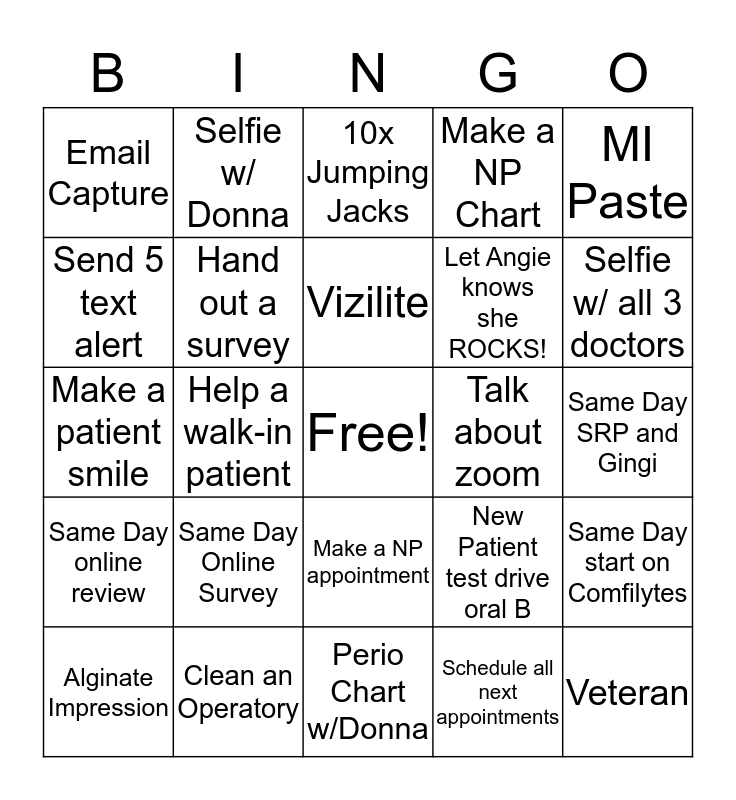 This bingo card has a free space and 24 words: Same Day Online Survey, Clean an Operatory, Vizilite, Alginate Impression, MI Paste, Email Capture, Send 5 text alert, Selfie w/ Donna, Talk about zoom, Make a NP appointment, Let Angie knows she ROCKS!, Make a patient smile, New Patient test drive oral B, Same Day start on Comfilytes, Hand out a survey, Schedule all next appointments, Same Day SRP and Gingi, 10x Jumping Jacks, Selfie w/ all 3 doctors, Help a walk-in patient, Veteran, Same Day online review, Make a NP Chart and Perio Chart w/Donna.