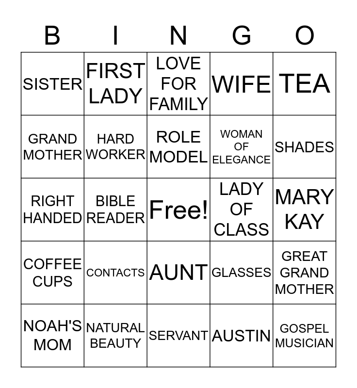 This bingo card has a free space and 24 words: CONTACTS, NATURAL BEAUTY, ROLE MODEL, NOAH'S MOM, TEA, SISTER, GRAND MOTHER, FIRST LADY, LADY OF CLASS, AUNT, WOMAN OF ELEGANCE, RIGHT HANDED, GLASSES, GREAT GRAND MOTHER, HARD WORKER, AUSTIN, MARY KAY, LOVE FOR FAMILY, SHADES, BIBLE READER, GOSPEL MUSICIAN, COFFEE CUPS, WIFE and SERVANT.