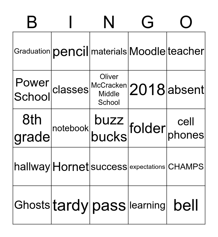 This bingo card has a free space and 24 words: Hornet, tardy, Oliver McCracken Middle School, Ghosts, teacher, Graduation, Power School, pencil, folder, success, 2018, 8th grade, expectations, CHAMPS, classes, learning, cell phones, materials, absent, notebook, bell, hallway, Moodle and pass.