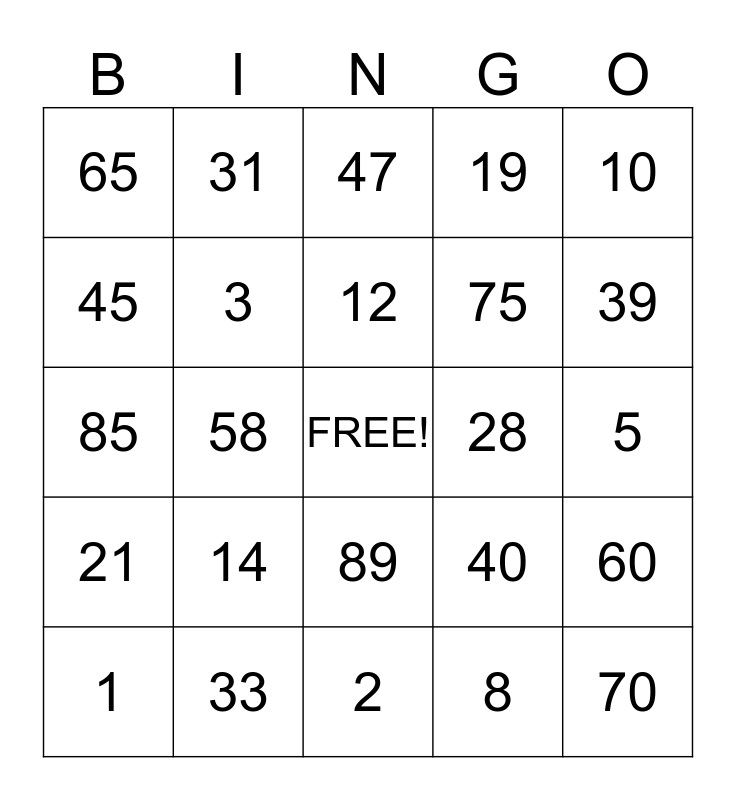 This bingo card has a free space and 24 words: 14, 33, 12, 1, 10, 65, 45, 31, 28, 89, 75, 85, 40, 60, 3, 8, 5, 47, 39, 58, 70, 21, 19 and 2.