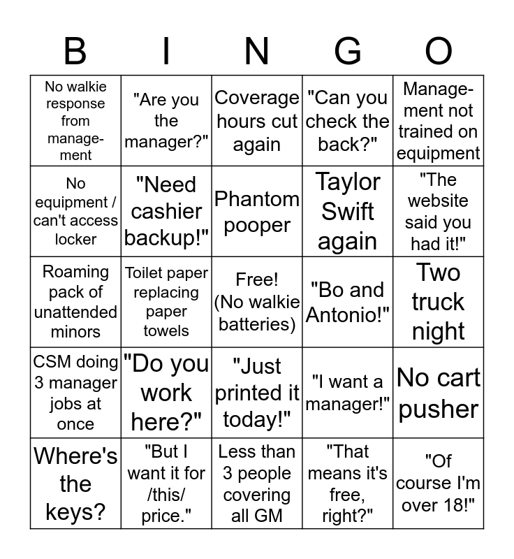 This bingo card has a free space and 24 words: "Do you work here?", "But I want it for /this/ price.", Phantom pooper, Where's the keys?, Manage-ment not trained on equipment, No walkie response from manage-ment, No equipment / can't access locker, "Are you the manager?", "Bo and Antonio!", "Just printed it today!", Taylor Swift again, Roaming pack of unattended minors, "I want a manager!", No cart pusher, "Need cashier backup!", "That means it's free, right?", Two truck night, Coverage hours cut again, "The website said you had it!", Toilet paper replacing paper towels, "Of course I'm over 18!", CSM doing 3 manager jobs at once, "Can you check the back?" and Less than 3 people covering all GM.