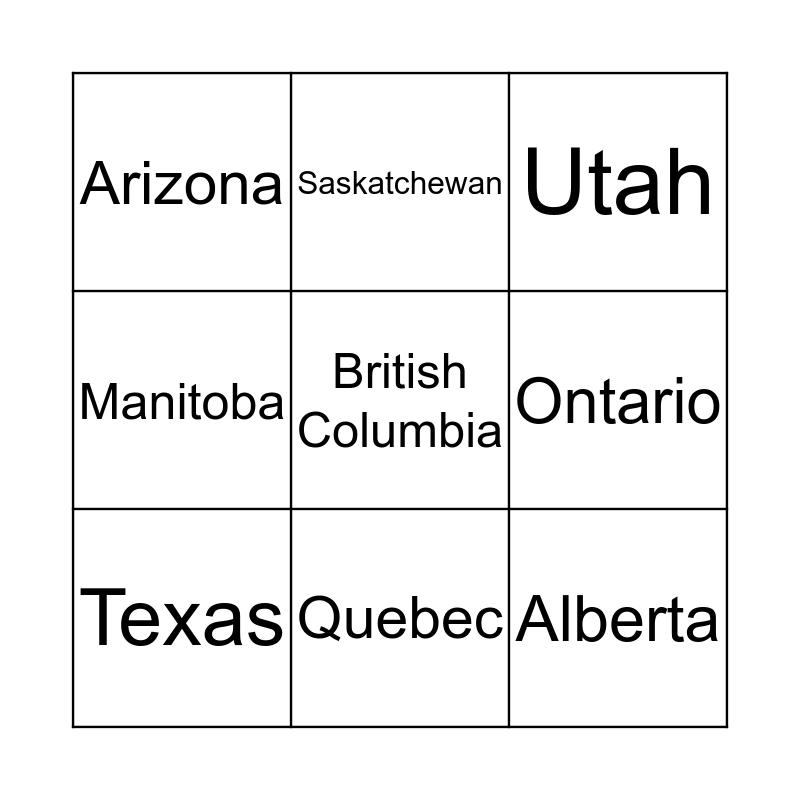 This bingo card has a free space and 8 words: Ontario, Utah, Saskatchewan, Texas, Arizona, Alberta, Manitoba and Quebec.