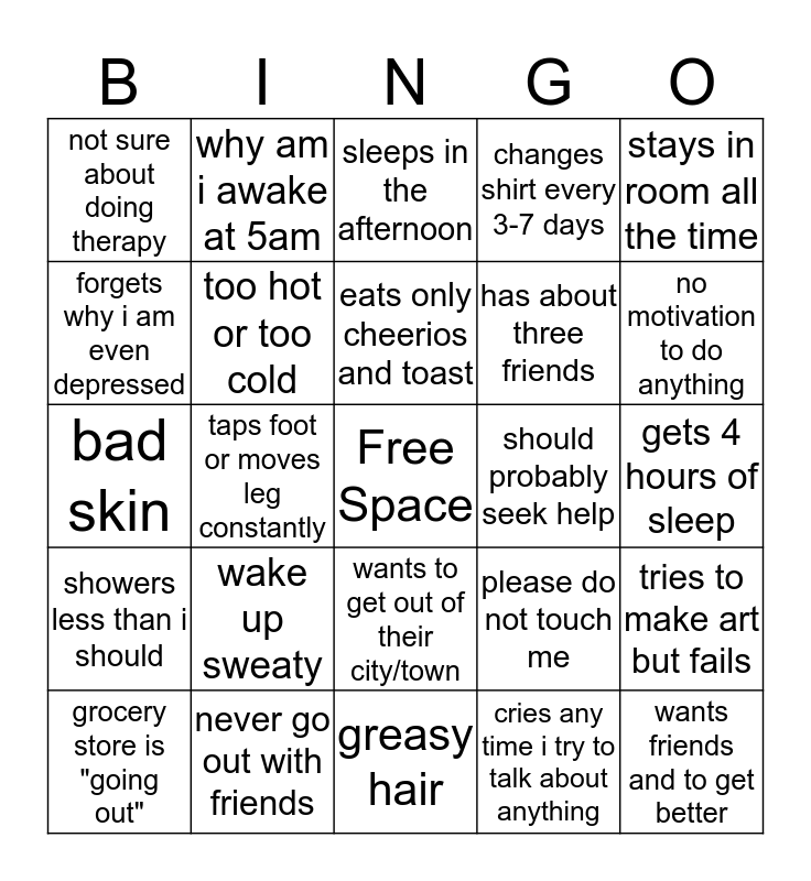 This bingo card has a free space and 24 words: wake up sweaty, never go out with friends, eats only cheerios and toast, grocery store is "going out", stays in room all the time, not sure about doing therapy, forgets why i am even depressed, why am i awake at 5am, should probably seek help, wants to get out of their city/town, has about three friends, bad skin, please do not touch me, tries to make art but fails, too hot or too cold, cries any time i try to talk about anything, gets 4 hours of sleep, sleeps in the afternoon, no motivation to do anything, taps foot or moves leg constantly, wants friends and to get better, showers less than i should, changes shirt every 3-7 days and greasy hair.
