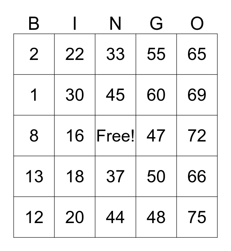 This bingo card has a free space and 24 words: 12, 18, 45, 48, 65, 2, 22, 33, 47, 72, 8, 30, 50, 66, 1, 20, 44, 55, 69, 13, 16, 37, 60 and 75.