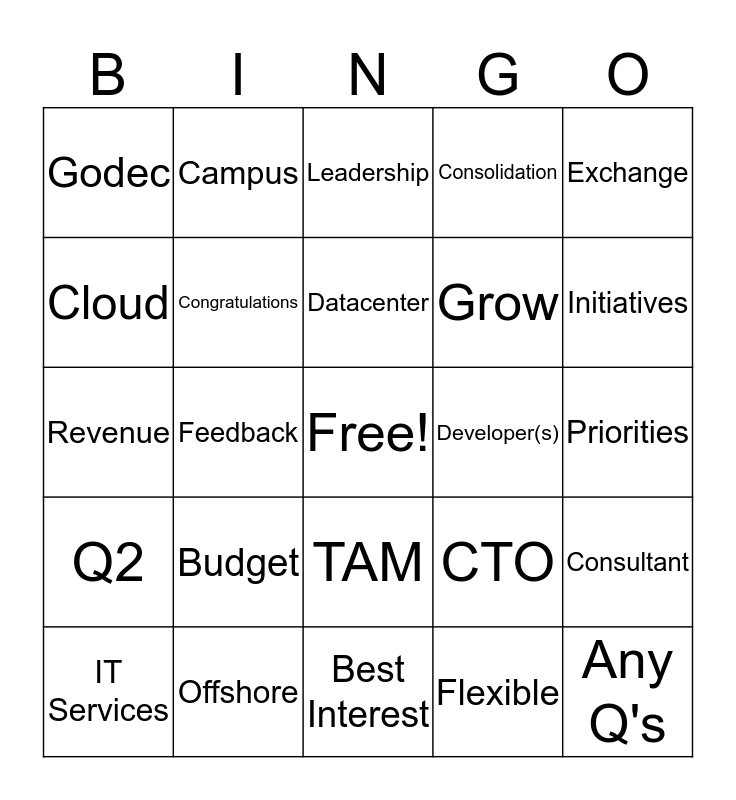 This bingo card has a free space and 51 words: Agile, Any Q's, Azure, Best Interest, Budget, Busy, Campus, Changes, Cloud, Compliance, Congratulations, Consolidation, Consultant, CTO, Customer, Cutting Edge, Datacenter, Developer(s), Direction, Exchange, Feedback, Flexible, Godec, Grow, IaaS, Infrastructure, Initiatives, Innovative, IT Services, Leadership, Management, Microsoft, Migration, Networking, O365, Offshore, Operate at Speed of Business, PaaS, People First, Policies, Priorities, Q2, Q3, Quality, ReOrg, Re-Think, Revenue, SaaS, Security, TAM and Value.